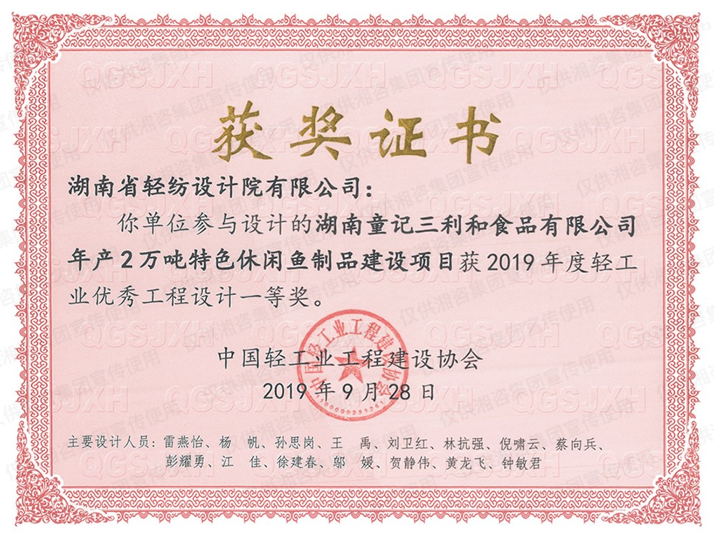 中國輕工業(yè)工程建設(shè)協(xié)會優(yōu)秀工程設(shè)計一等獎