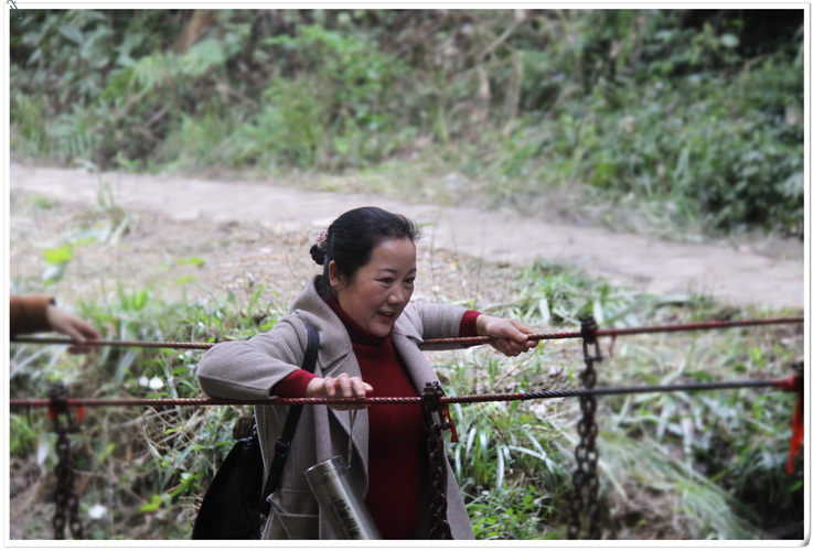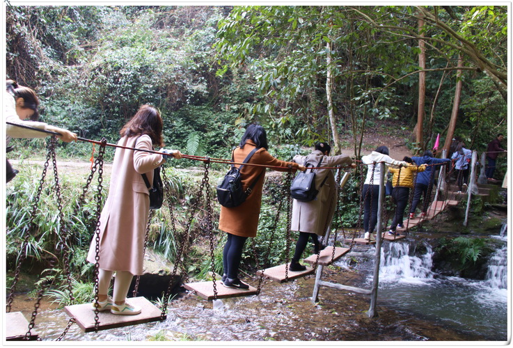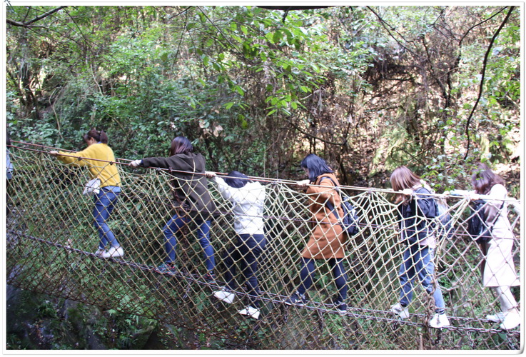 本次春游第一站為皇龍大峽谷。峽谷內,綠樹成蔭,溪水潺潺,入眼滿是原生態(tài)植被山林。沿著山路,景區(qū)內精心設計的浮動梅花樁、鐵索橋、壁虎網等道路并沒有困住湘咨姑娘們向上的腳步。大家不懼挑戰(zhàn)之險,不畏攀登之苦,努力跨越沿途障礙,收獲了諸多樂趣。