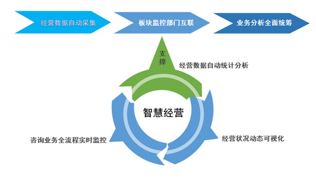 平臺(tái)以“智慧經(jīng)營(yíng)”為主線,集經(jīng)營(yíng)數(shù)據(jù)自動(dòng)統(tǒng)計(jì)分析、咨詢業(yè)務(wù)全流程實(shí)時(shí)監(jiān)控、經(jīng)營(yíng)狀況動(dòng)態(tài)可視化于一體,支撐公司實(shí)現(xiàn)經(jīng)營(yíng)數(shù)據(jù)自動(dòng)采集、板塊監(jiān)控部門互聯(lián)、業(yè)務(wù)分析全面統(tǒng)籌等目標(biāo)。平臺(tái)將匯聚各類型經(jīng)營(yíng)數(shù)據(jù),按照12個(gè)維度來(lái)統(tǒng)計(jì)分析、直觀展示業(yè)務(wù)經(jīng)營(yíng)情況,對(duì)數(shù)據(jù)逐步細(xì)化、深入分析,并為科學(xué)預(yù)判未來(lái)生產(chǎn)經(jīng)營(yíng)走勢(shì)提供了可靠依據(jù)。