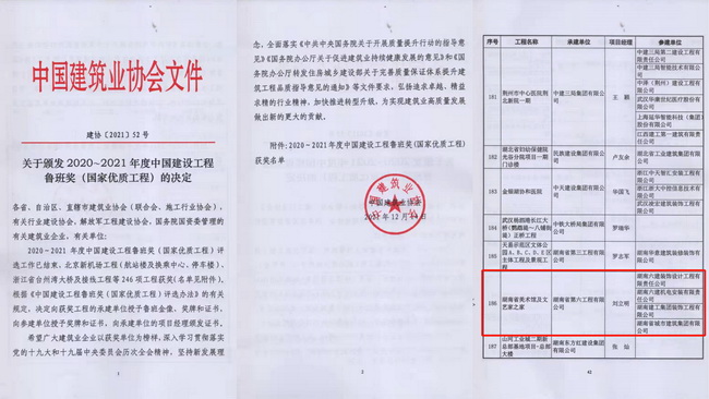 近日,中國建筑業(yè)協(xié)會(huì)公布“2020~2021年度中國建設(shè)工程魯班獎(jiǎng)(國家優(yōu)質(zhì)工程)獲獎(jiǎng)工程名單”,省咨詢公司代建的湖南省美術(shù)館項(xiàng)目、湖南文藝家之家項(xiàng)目、湖南美術(shù)館展陳裝修工程三個(gè)項(xiàng)目成功入選。據(jù)悉,這是公司代建項(xiàng)目首次榮膺此項(xiàng)殊榮,創(chuàng)造了公司代建工作新的歷史。