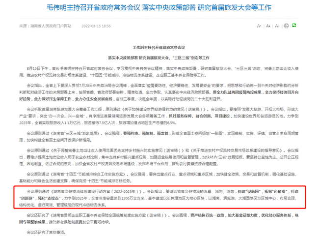 2022年8月15日下午,省長(zhǎng)毛偉明主持召開(kāi)省政府常務(wù)會(huì)議,研究審議通過(guò)了省咨詢公司編制的《湖南省冷鏈物流體系建設(shè)行動(dòng)方案(2022-2025年)》課題,會(huì)議指出要結(jié)合我省冷鏈物流的流量、流向、流效,構(gòu)建“設(shè)施網(wǎng)”,拓寬“運(yùn)輸線”,打造“創(chuàng)新鏈”,強(qiáng)化“支撐點(diǎn)”,力爭(zhēng)到2025年,全省冷庫(kù)容量達(dá)到1500萬(wàn)立方米,基本建成以長(zhǎng)株潭地區(qū)為核心區(qū)塊,以湘南、洞庭湖、大湘西地區(qū)為區(qū)域中心,布局合理、結(jié)構(gòu)優(yōu)化、運(yùn)行高效、管理規(guī)范的現(xiàn)代冷鏈物流體系。