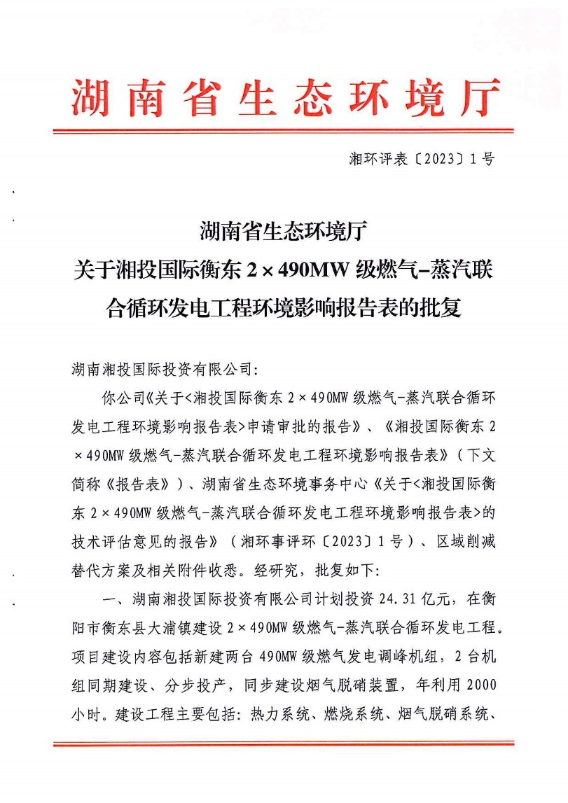 2023年3月9日,由省咨詢公司編制的《湘投國際衡東2×490MW級燃?xì)?蒸汽聯(lián)合循環(huán)發(fā)電工程環(huán)境影響報(bào)告表》順利獲得湖南省生態(tài)環(huán)境廳批復(fù)(湘環(huán)評表[2023]1號),為項(xiàng)目后續(xù)依法合規(guī)開工建設(shè)奠定了堅(jiān)實(shí)基礎(chǔ)。