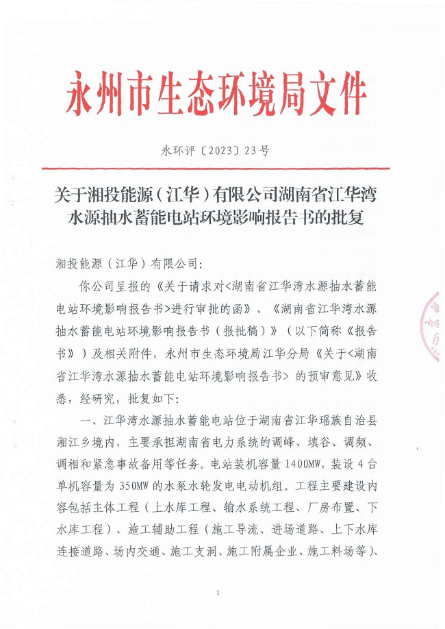 近日,我司環(huán)境保護咨詢事業(yè)部負責撰寫的《湖南省江華灣水源抽水蓄能電站環(huán)境影響報告書》,順利通過了永州市生態(tài)環(huán)境局的評審并取得批復(永環(huán)評〔2023〕23號)。