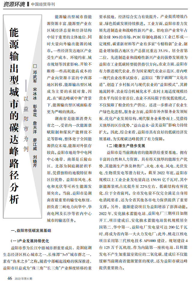 近日,由我司撰寫的《能源輸出型城市的碳達峰路徑分析—以益陽市為例》一文刊發(fā)于《中國經貿導刊》2023年第6期,作者為我司生態(tài)規(guī)劃咨詢事業(yè)部鄧武軍、彭朵花、詹天洋、廖江威。