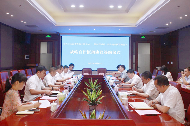 8月14日上午,湘咨集團與中鐵中南投資發(fā)展有限公司(以下簡稱中鐵中南公司)舉行戰(zhàn)略合作協(xié)議簽約儀式。湘咨集團黨委書記、董事長、總經(jīng)理詹瓊雷,中鐵中南公司總經(jīng)理陳國良出席座談并見證簽約,湘咨集團董事、副總經(jīng)理伍玉勇與中鐵中南公司副總經(jīng)理黃文理分別代表雙方簽署戰(zhàn)略合作協(xié)議,雙方領導班子成員及相關部門負責人參加儀式。