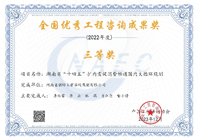 近日,中國(guó)工程咨詢(xún)協(xié)會(huì)公布了2022年度全國(guó)優(yōu)秀工程咨詢(xún)成果獎(jiǎng)獲獎(jiǎng)項(xiàng)目名單,由湘咨集團(tuán)編制的三項(xiàng)成果榮獲全國(guó)優(yōu)秀工程咨詢(xún)成果獎(jiǎng)三等獎(jiǎng)。據(jù)悉,湖南省此次共有7家咨詢(xún)機(jī)構(gòu)計(jì)12項(xiàng)成果獲獎(jiǎng),湘咨集團(tuán)獲獎(jiǎng)數(shù)量占總獲獎(jiǎng)數(shù)的四分之一。