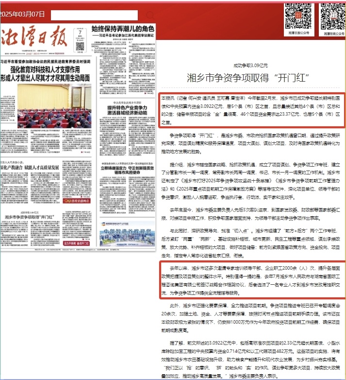 2025年3月6日,據(jù)湘潭日?qǐng)?bào)報(bào)道,截至2月末,湘鄉(xiāng)市成功爭(zhēng)取超長(zhǎng)期國(guó)債和中央預(yù)算內(nèi)資金3.092億元,儲(chǔ)備項(xiàng)目資金需求23.37億元,兩項(xiàng)指標(biāo)領(lǐng)跑湘潭市縣區(qū)。湘咨集團(tuán)首創(chuàng)的“專家駐點(diǎn)”政企合作模式成為關(guān)鍵推力。